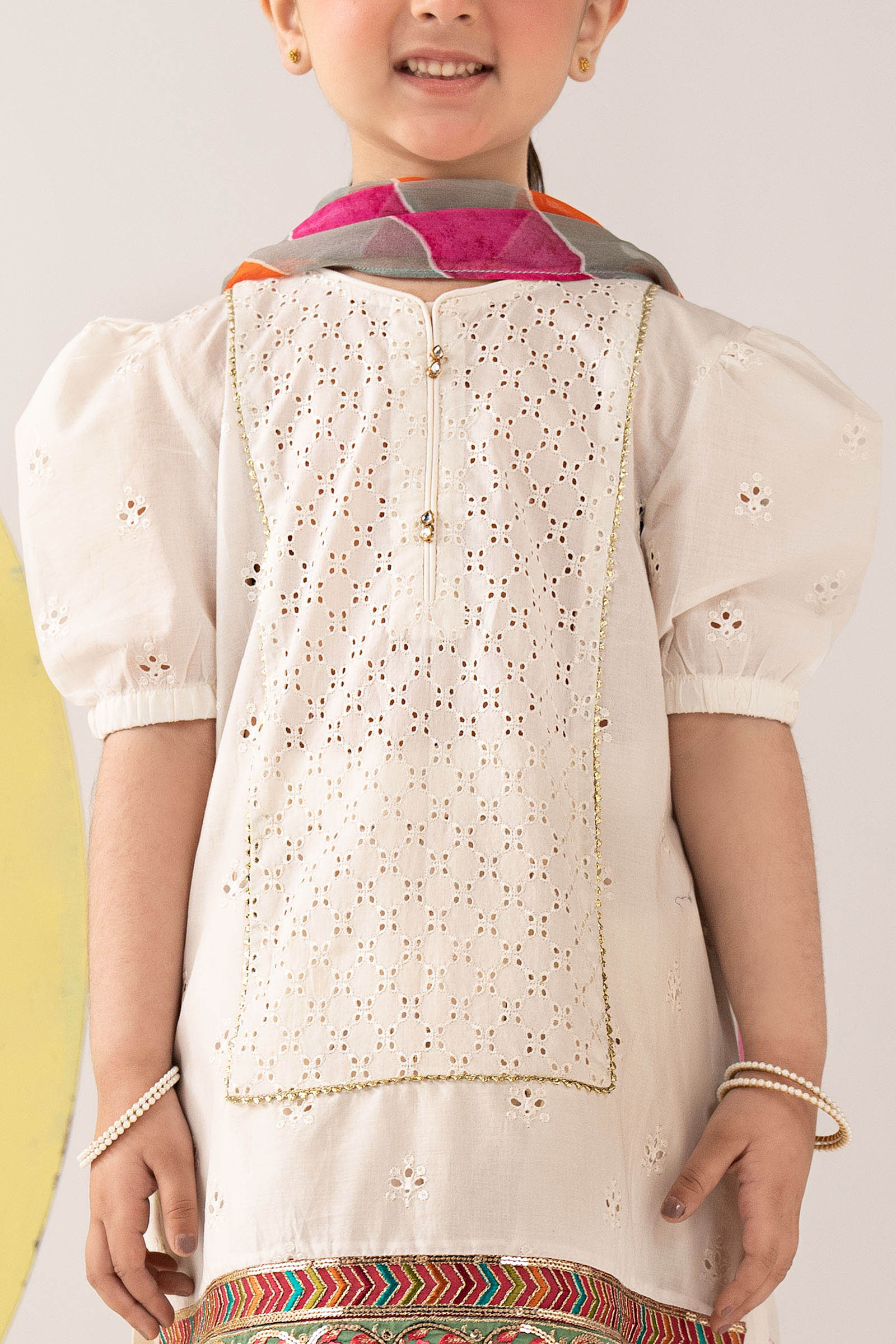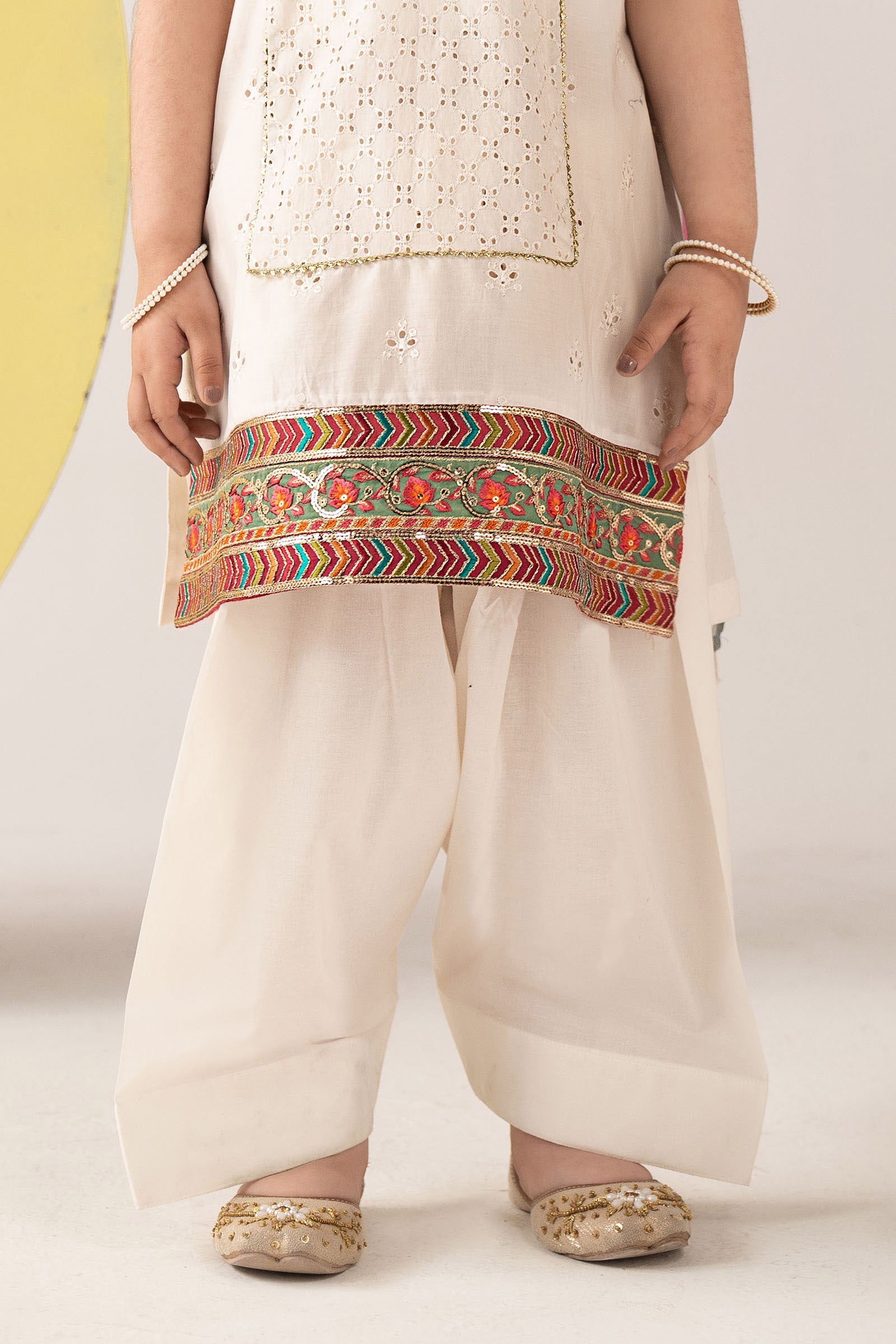 Round Schiffli Embroidered Neckline With Pearl Tassel & Gotta Lace Detailing