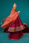 Long paneled frock with panni, sequin, and tilla embroidery border and sleeves paired with tie and dye contrast dupatta with embroidered motives and straight matching trousers.