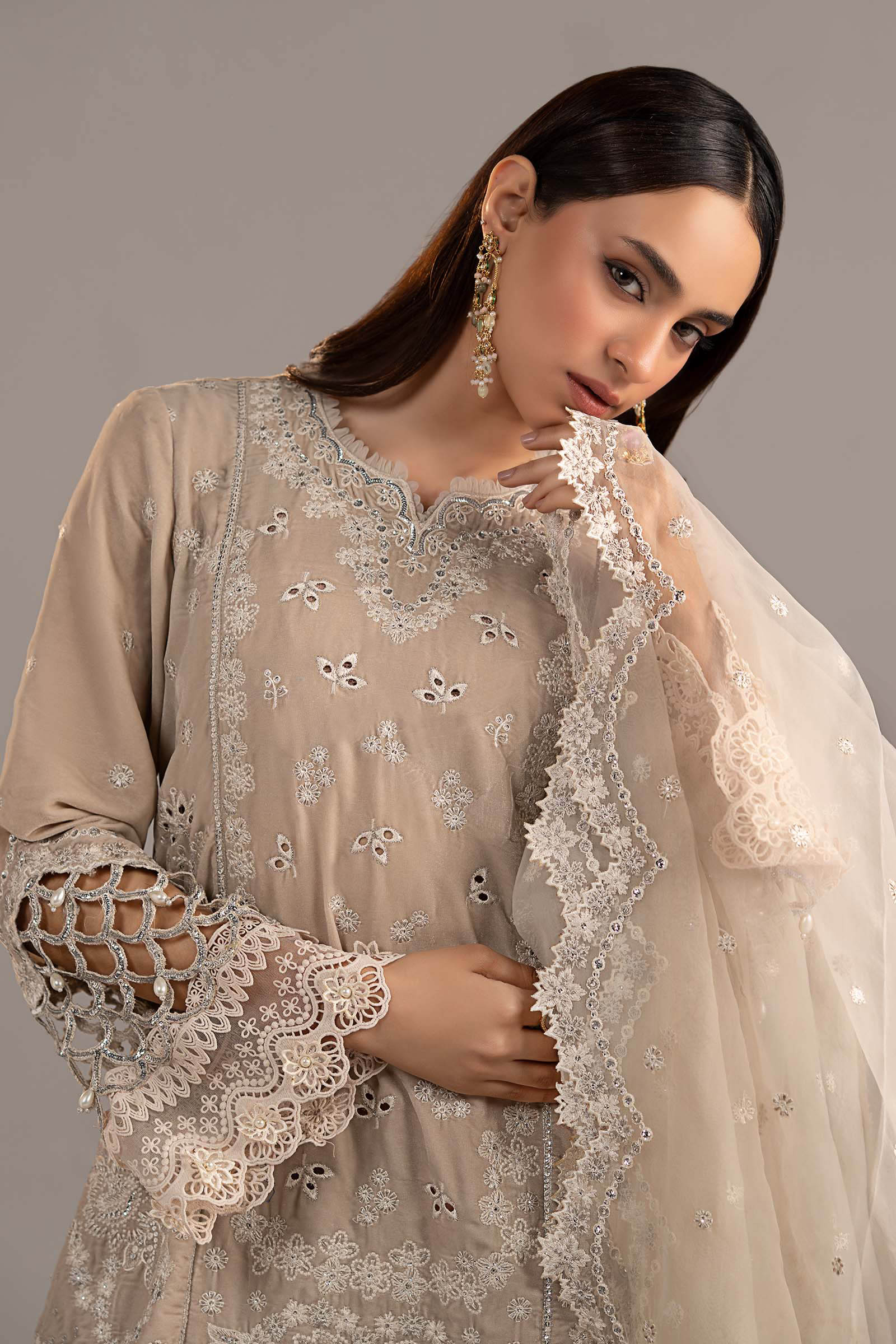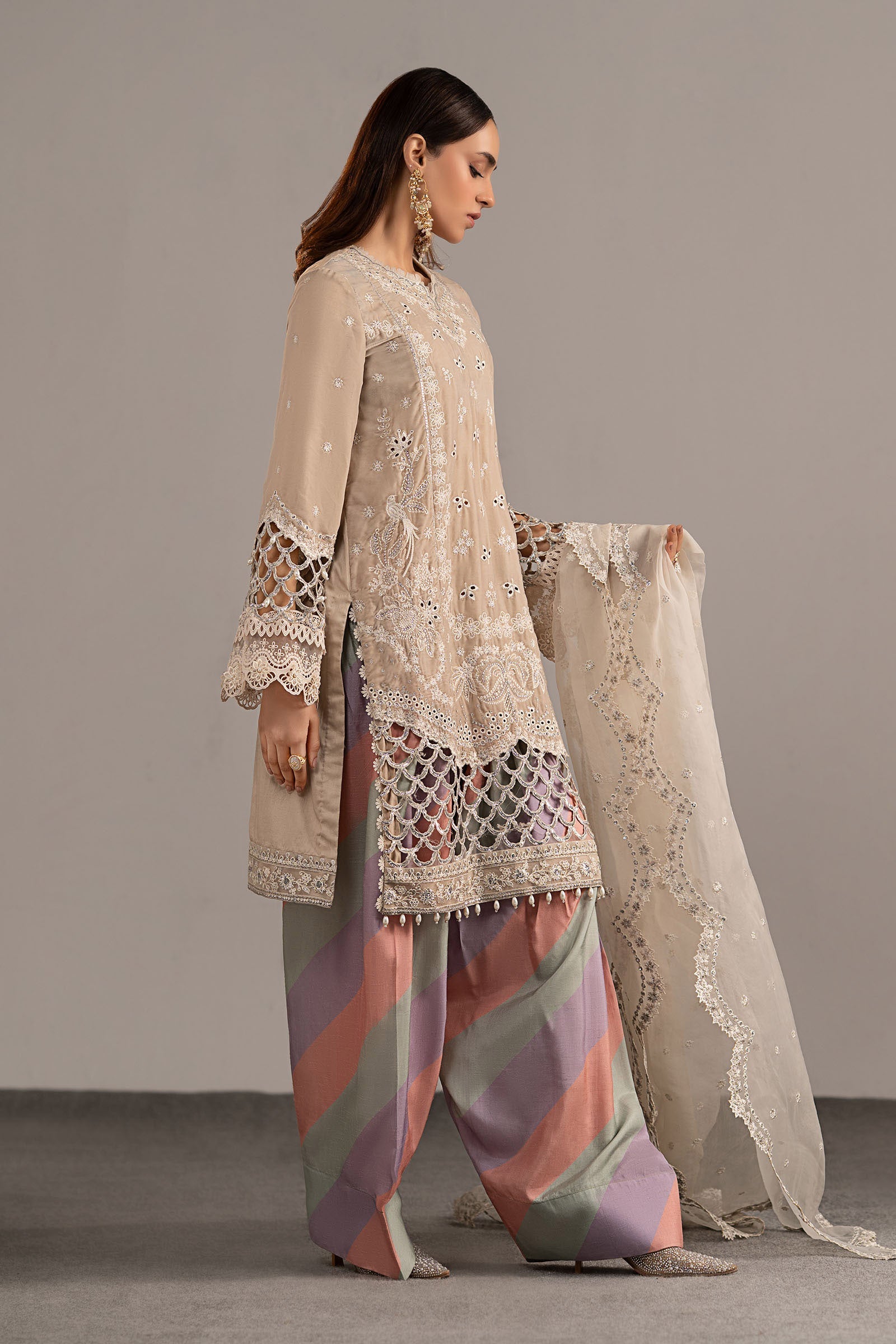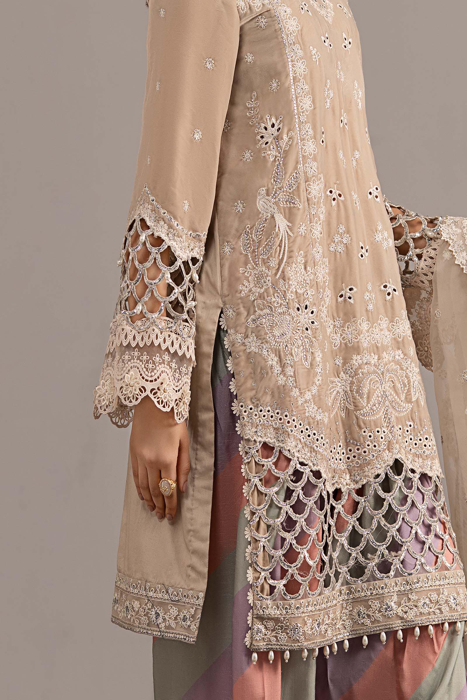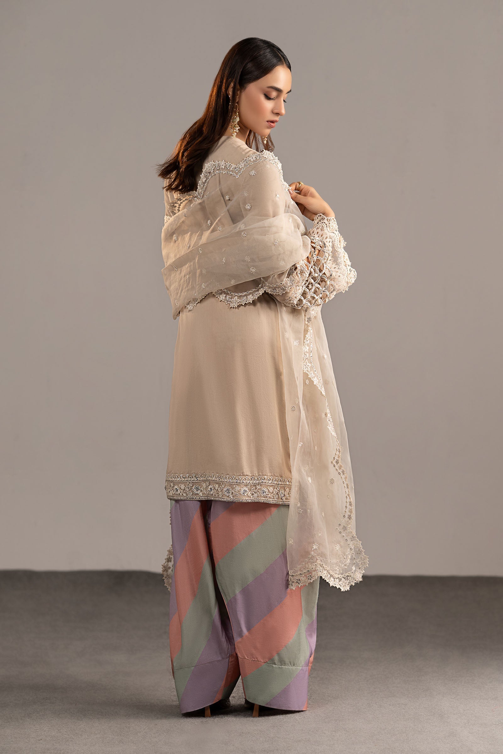 All laces used for finishing of the stitched outfit especially the dupatta or trousers may vary from the shoot.