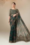 With eccentric floral imagery and a sophisticated teal palette, this embroidered organza saree is a sight to behold. Featuring a digitally printed saree depicting floras swirling with dainty sequins, tilla, and threadwork artsy that create a mesmerizing composition, making it an understated choice for all summer alfresco events. It is paired with sequins, tilla, and thread embroidered blouse, culminating in a crystal and stone embellished boat neckline, this design makes the perfect look for a summer affair.