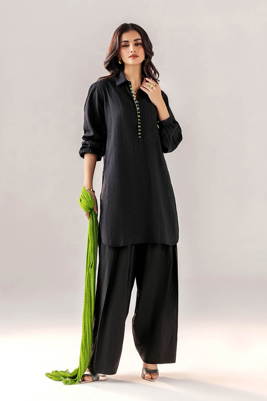 All laces used for finishing of the stitched outfit especially the dupatta or trousers may vary from the shoot.